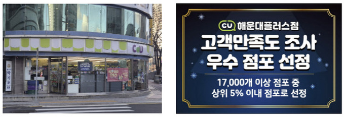 19일 부산 해운대구에 따르면 CU편의점 본사는 매년 2회에 걸쳐 전국 1만 7000개 점포를 대상으로 직원, 상품관리, 서비스 및 청결상태, 사전 예고 없는 모니터링을 진행하여 상위 5% 이내 높은 점수를 받은 점포를 우수점포로 선정하고 있다.
